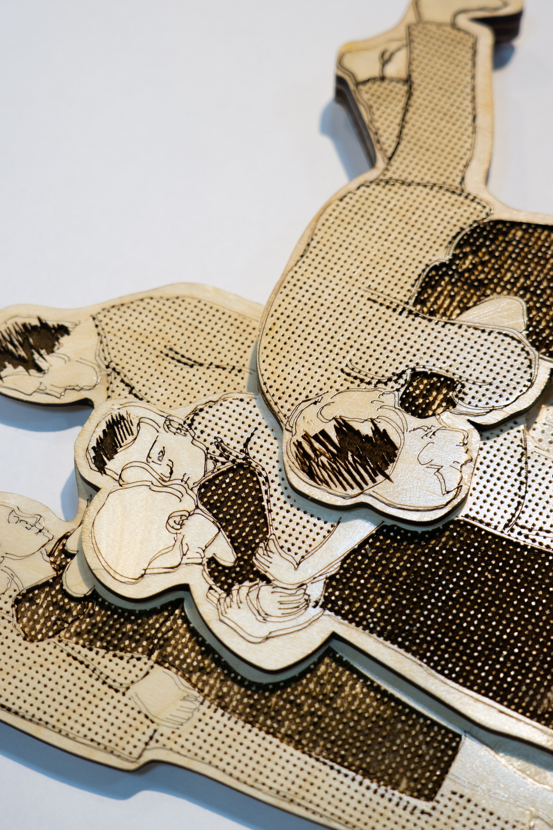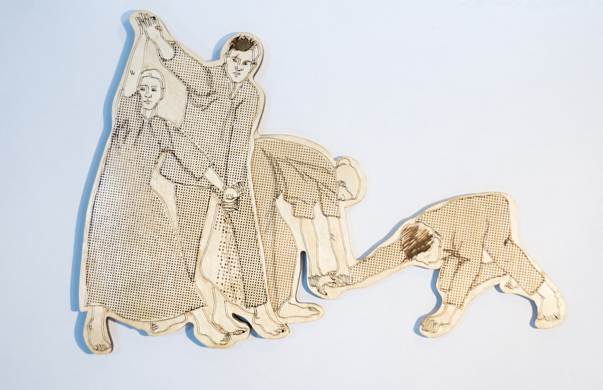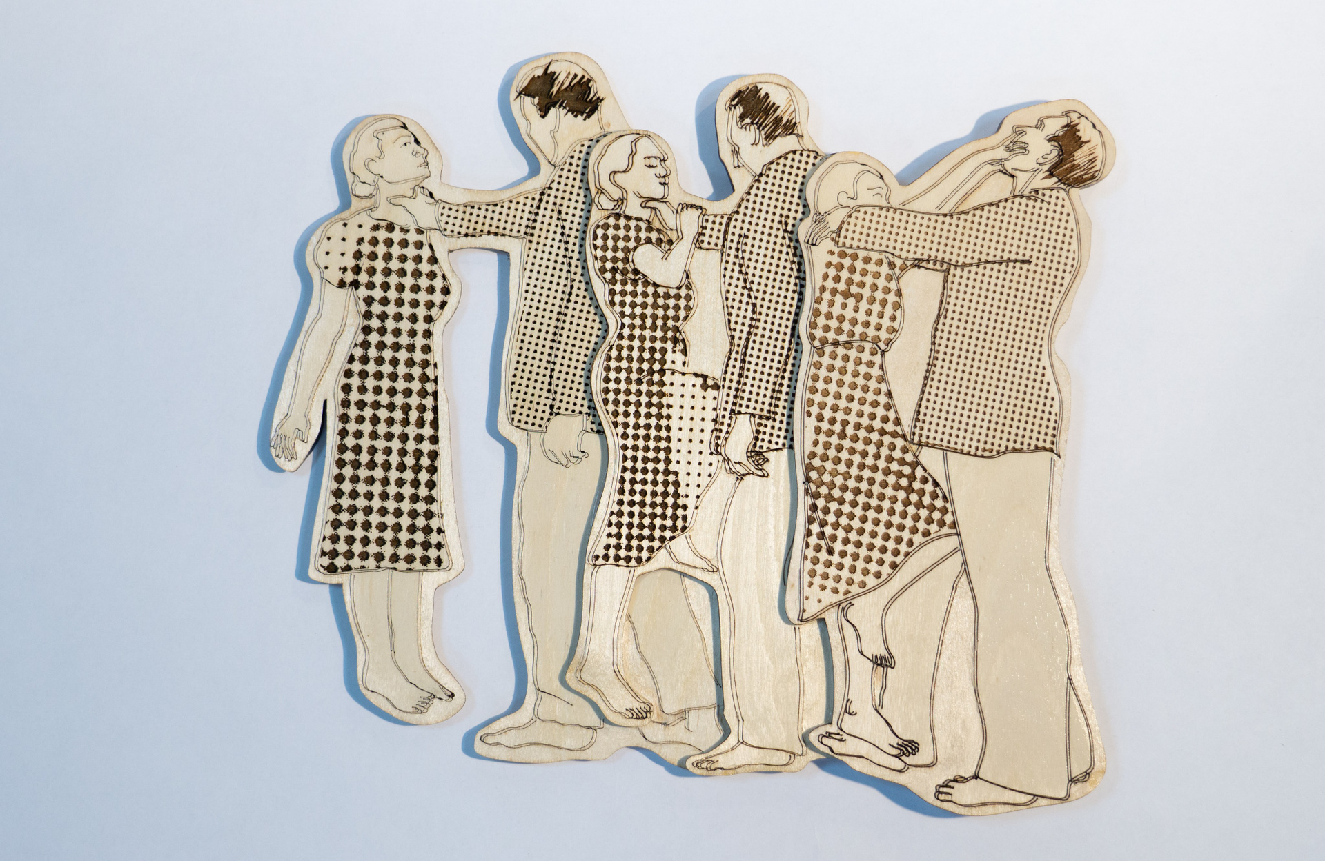 В моих объектах невозможность до конца разобрать происходящее на изображении вне контекста. Толи романтические сцены, то ли сцены насилия, то ли танцы рождают в нас все возможные интерпретации. Единственное, что может внести нам ясность- это текст. Но его нет. Деконструкция и коллажность еще сильнее усиливает манипуляцию. Своего рода происходит насилие и над изображением и над материалом.