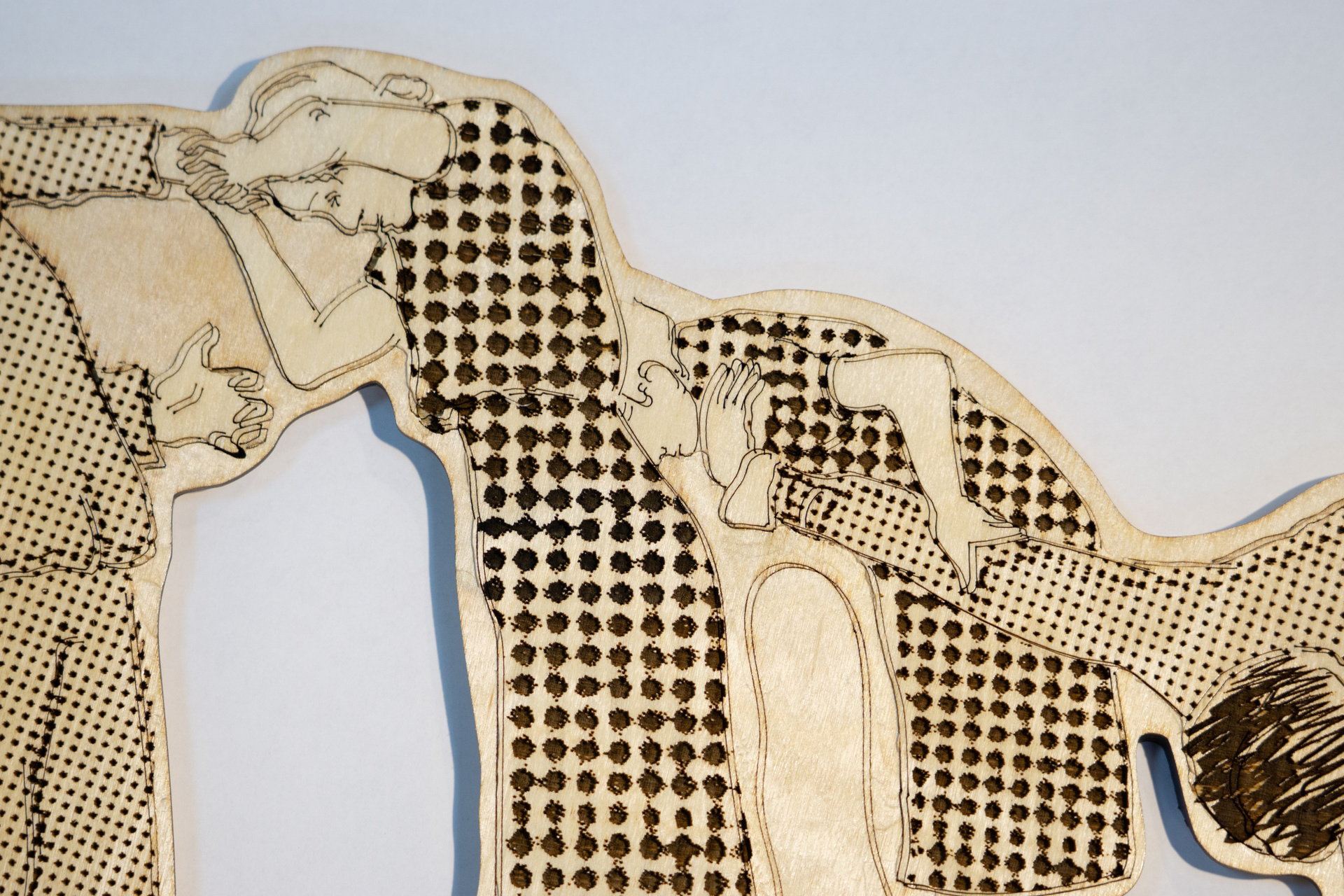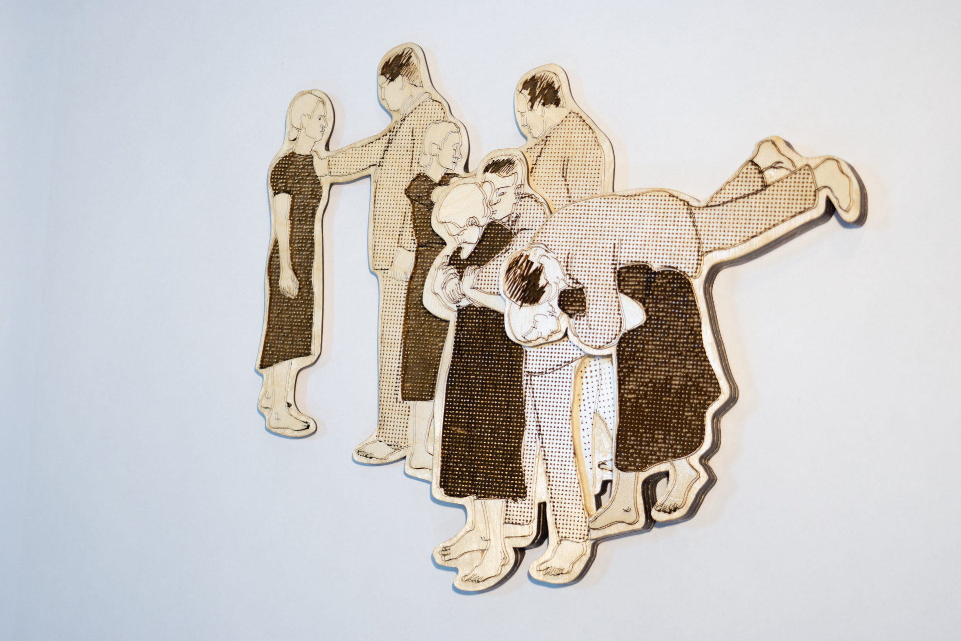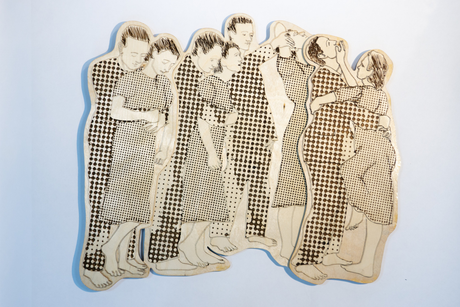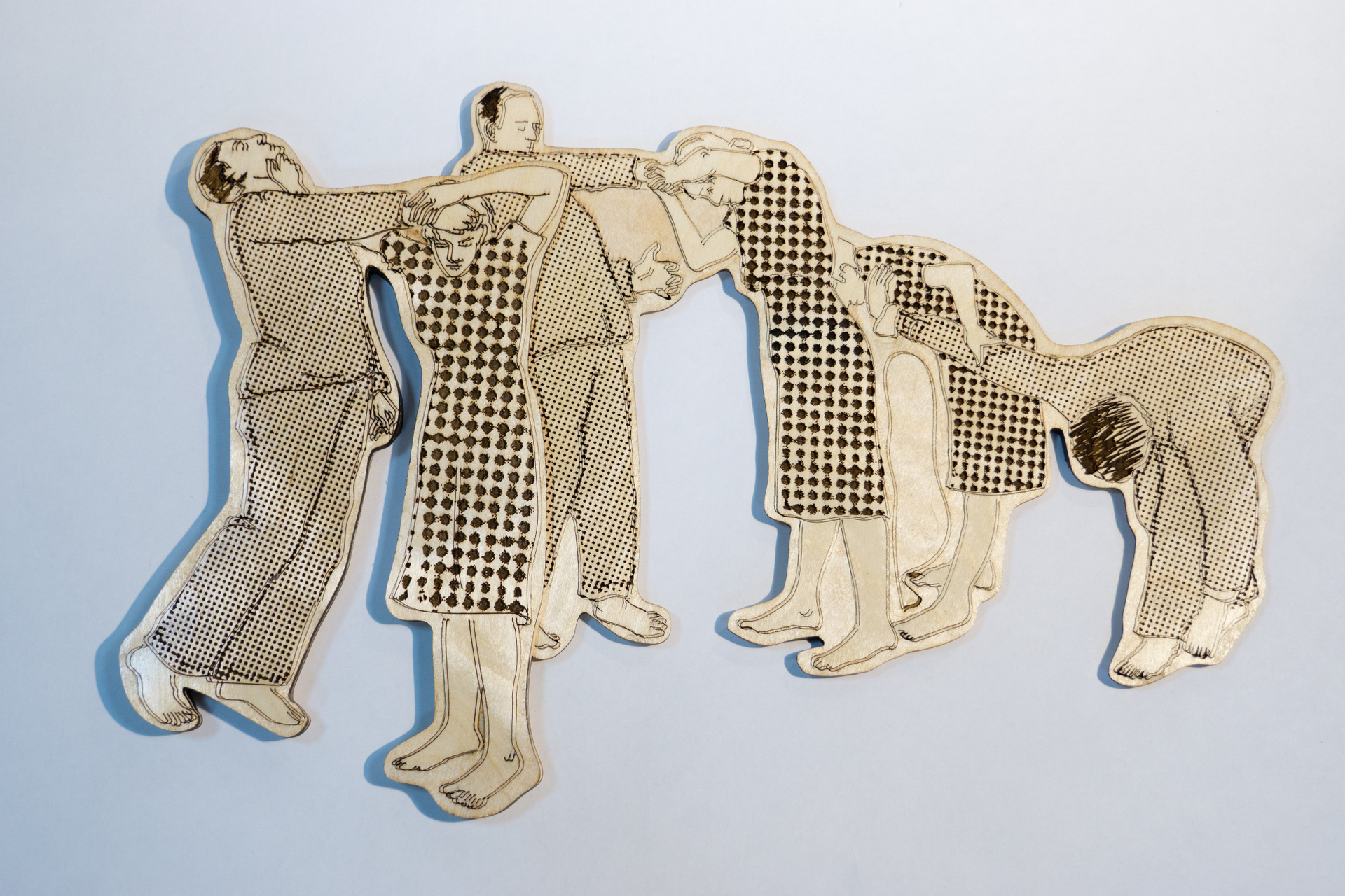 В моих объектах невозможность до конца разобрать происходящее на изображении вне контекста. Толи романтические сцены, то ли сцены насилия, то ли танцы рождают в нас все возможные интерпретации. Единственное, что может внести нам ясность- это текст. Но его нет. Деконструкция и коллажность еще сильнее усиливает манипуляцию. Своего рода происходит насилие и над изображением и над материалом.